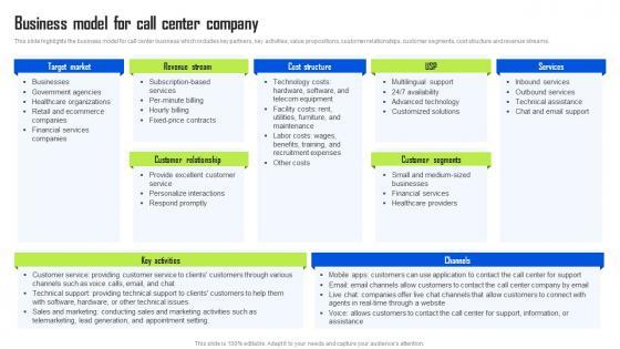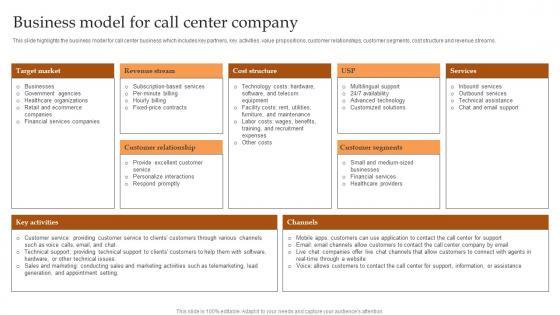 This slide highlights the business model for call center business which includes key partners, key activities, value propositions, customer relationships, customer segments, cost structure and revenue streams. Want to ace your presentation in front of a live audience Our Business Model For Call Center Company BPO Center Business Plan Microsoft Pdf can help you do that by engaging all the users towards you. Slidegeeks experts have put their efforts and expertise into creating these impeccable powerpoint presentations so that you can communicate your ideas clearly. Moreover, all the templates are customizable, and easy-to-edit and downloadable. Use these for both personal and commercial use. This slide highlights the business model for call center business which includes key partners, key activities, value propositions, customer relationships, customer segments, cost structure and revenue streams.
