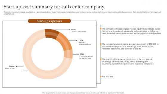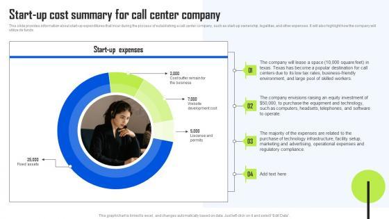 This slide provides information about start-up expenditures that incur during the process of establishing a call center company, such as start-up ownership, legalities, and other expenses. It will also highlight how the company will utilize its funds. Do you know about Slidesgeeks Start Up Cost Summary For Call Center Company BPO Center Business Plan Infographics Pdf These are perfect for delivering any kind od presentation. Using it, create PowerPoint presentations that communicate your ideas and engage audiences. Save time and effort by using our pre-designed presentation templates that are perfect for a wide range of topic. Our vast selection of designs covers a range of styles, from creative to business, and are all highly customizable and easy to edit. Download as a PowerPoint template or use them as Google Slides themes. This slide provides information about start-up expenditures that incur during the process of establishing a call center company, such as start-up ownership, legalities, and other expenses. It will also highlight how the company will utilize its funds.
