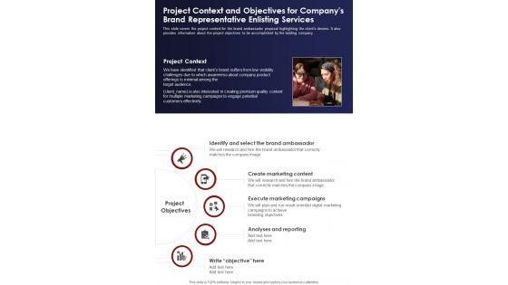 Presenting you an exemplary Project Context And Objectives For Companys Brand Representative One Pager Sample Example Document. Our one-pager comprises all the must-have essentials of an inclusive document. You can edit it with ease, as its layout is completely editable. With such freedom, you can tweak its design and other elements to your requirements. Download this Project Context And Objectives For Companys Brand Representative Enlisting Services One Pager Sample Example Document brilliant piece now. Our Project Context And Objectives For Companys Brand Representative One Pager Sample Example Document are topically designed to provide an attractive backdrop to any subject. Use them to look like a presentation pro.