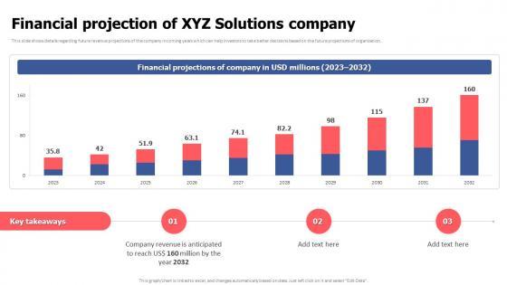 This slide shows details regarding future revenue projections of the company in coming years which can help investors to take better decisions based on the future projections of organization. Get a simple yet stunning designed Financial Projection Of XYZ Solutions Company Cloud Game Development Fundraising Pitch Deck. It is the best one to establish the tone in your meetings. It is an excellent way to make your presentations highly effective. So, download this PPT today from Slidegeeks and see the positive impacts. Our easy-to-edit Financial Projection Of XYZ Solutions Company Cloud Game Development Fundraising Pitch Deck can be your go-to option for all upcoming conferences and meetings. So, what are you waiting for Grab this template today. This slide shows details regarding future revenue projections of the company in coming years which can help investors to take better decisions based on the future projections of organization.