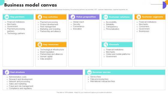 This slide highlights the companys business model canvas to understand its overall business functioning. It involves key partners, key activities, USP, customer relationships, customer segments, etc. Find a pre-designed and impeccable Business Model Canvas Payment Gateway Company Business Model BMC SS V. The templates can ace your presentation without additional effort. You can download these easy-to-edit presentation templates to make your presentation stand out from others. So, what are you waiting for Download the template from Slidegeeks today and give a unique touch to your presentation. This slide highlights the companys business model canvas to understand its overall business functioning. It involves key partners, key activities, USP, customer relationships, customer segments, etc.