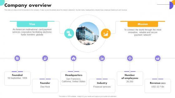 This slide provides a brief introduction to the company. It also covers the details about the mission statement, founder name, headquarters, industry type, employee headcount, and revenue. Boost your pitch with our creative Company Overview Payment Gateway Company Business Model BMC SS V. Deliver an awe-inspiring pitch that will mesmerize everyone. Using these presentation templates you will surely catch everyones attention. You can browse the ppts collection on our website. We have researchers who are experts at creating the right content for the templates. So you do not have to invest time in any additional work. Just grab the template now and use them. This slide provides a brief introduction to the company. It also covers the details about the mission statement, founder name, headquarters, industry type, employee headcount, and revenue.