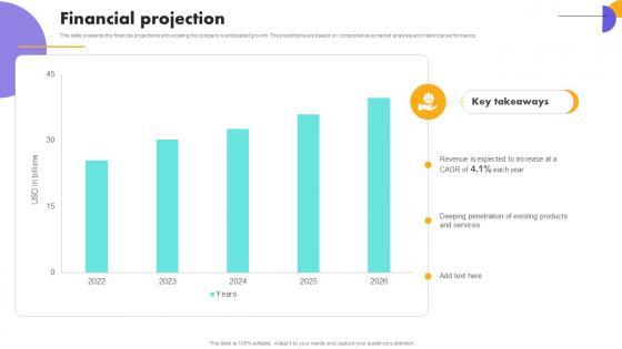 This slide presents the financial projections showcasing the companys anticipated growth. The predictions are based on comprehensive market analysis and historical performance. There are so many reasons you need a Financial Projection Payment Gateway Company Business Model BMC SS V. The first reason is you can not spend time making everything from scratch, Thus, Slidegeeks has made presentation templates for you too. You can easily download these templates from our website easily. This slide presents the financial projections showcasing the companys anticipated growth. The predictions are based on comprehensive market analysis and historical performance.