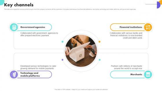 This slide showcases the various points through which the company connects with its customers. It includes channels such as financial institutions, merchants, technology and mobile platforms, and government agencies. From laying roadmaps to briefing everything in detail, our templates are perfect for you. You can set the stage with your presentation slides. All you have to do is download these easy-to-edit and customizable templates. Key Channels Payment Gateway Company Business Model BMC SS V will help you deliver an outstanding performance that everyone would remember and praise you for. Do download this presentation today. This slide showcases the various points through which the company connects with its customers. It includes channels such as financial institutions, merchants, technology and mobile platforms, and government agencies.