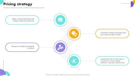 This slide showcases how the company will determine product and service prices. Do you have an important presentation coming up Are you looking for something that will make your presentation stand out from the rest Look no further than Pricing Strategy Payment Gateway Company Business Model BMC SS V. With our professional designs, you can trust that your presentation will pop and make delivering it a smooth process. And with Slidegeeks, you can trust that your presentation will be unique and memorable. So why wait Grab Pricing Strategy Payment Gateway Company Business Model BMC SS V today and make your presentation stand out from the rest This slide showcases how the company will determine product and service prices.