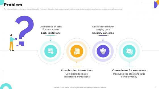 The following slide covers the major problems addressed by the company. It includes challenges such as cash limitations, cross-border transactions, security concerns and convenience for consumers. Whether you have daily or monthly meetings, a brilliant presentation is necessary. Problem Payment Gateway Company Business Model BMC SS V can be your best option for delivering a presentation. Represent everything in detail using Problem Payment Gateway Company Business Model BMC SS V and make yourself stand out in meetings. The template is versatile and follows a structure that will cater to your requirements. All the templates prepared by Slidegeeks are easy to download and edit. Our research experts have taken care of the corporate themes as well. So, give it a try and see the results. The following slide covers the major problems addressed by the company. It includes challenges such as cash limitations, cross-border transactions, security concerns and convenience for consumers.
