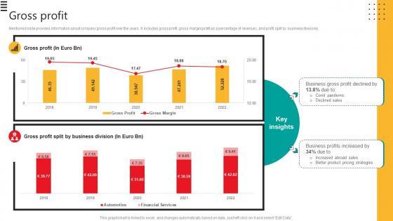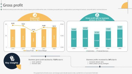 Mentioned slide provides information about company gross profit over the years. It includes gross profit, gross margin profit as a percentage of revenue , and profit split by business divisions.Formulating a presentation can take up a lot of effort and time, so the content and message should always be the primary focus. The visuals of the PowerPoint can enhance the presenters message, so our Gross Profit Automotive Manufacturing Company Profile CP SS V was created to help save time. Instead of worrying about the design, the presenter can concentrate on the message while our designers work on creating the ideal templates for whatever situation is needed. Slidegeeks has experts for everything from amazing designs to valuable content, we have put everything into Gross Profit Automotive Manufacturing Company Profile CP SS V. Mentioned slide provides information about company gross profit over the years. It includes gross profit, gross marginandprofit as a percentage of revenueand, and profit split by business divisions.