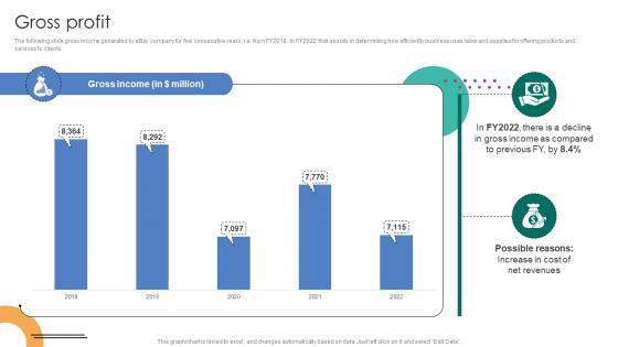 The following slide gross income generated by eBay company for five consecutive years, i.e. from FY2018 to FY2022 that assists in determining how efficiently business uses labor and supplies for offering products and services to clients.Crafting an eye-catching presentation has never been more straightforward. Let your presentation shine with this tasteful yet straightforward Gross Profit C2C Ecommerce Platform Company Profile CP SS V template. It offers a minimalistic and classy look that is great for making a statement. The colors have been employed intelligently to add a bit of playfulness while still remaining professional. Construct the ideal Gross Profit C2C Ecommerce Platform Company Profile CP SS V that effortlessly grabs the attention of your audience Begin now and be certain to wow your customers The following slide gross income generated by eBay company for five consecutive years, i.e. from FY2018 to FY2022 that assists in determining how efficiently business uses labor and supplies for offering products and services to clients.