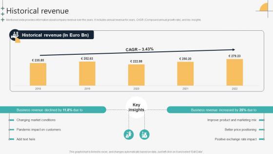 Mentioned slide provides information about company revenue over the years. It includes annual revenue for years, CAGR Compound annual growth rate , and key insights.Coming up with a presentation necessitates that the majority of the effort goes into the content and the message you intend to convey. The visuals of a PowerPoint presentation can only be effective if it supplements and supports the story that is being told. Keeping this in mind our experts created Historical Revenue Automotive Manufacturing Company Profile CP SS V to reduce the time that goes into designing the presentation. This way, you can concentrate on the message while our designers take care of providing you with the right template for the situation. Mentioned slide provides information about company revenue over the years. It includes annual revenue for years, CAGR andCompound annual growth rateand, and key insights.