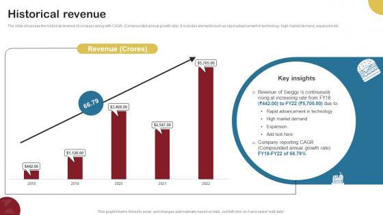 The slide showcase the historical revenue of company along with CAGR Compounded annual growth rate. It includes elements such as rapid advancement in technology, high market demand, expansion etc.Formulating a presentation can take up a lot of effort and time, so the content and message should always be the primary focus. The visuals of the PowerPoint can enhance the presenters message, so our Historical Revenue Food Delivery Company Profile CP SS V was created to help save time. Instead of worrying about the design, the presenter can concentrate on the message while our designers work on creating the ideal templates for whatever situation is needed. Slidegeeks has experts for everything from amazing designs to valuable content, we have put everything into Historical Revenue Food Delivery Company Profile CP SS V. The slide showcase the historical revenue of company along with CAGR Compounded annual growth rate. It includes elements such as rapid advancement in technology, high market demand, expansion etc.