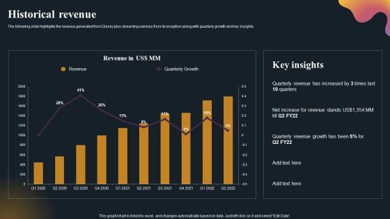 The following slide highlights the revenue generated from Disney plus streaming services from its inception along with quarterly growth and key insights. Whether you have daily or monthly meetings, a brilliant presentation is necessary. Company Profile For Online Video Service Provider Historical Revenue Topics PDF can be your best option for delivering a presentation. Represent everything in detail using Company Profile For Online Video Service Provider Historical Revenue Topics PDF and make yourself stand out in meetings. The template is versatile and follows a structure that will cater to your requirements. All the templates prepared by Slidegeeks are easy to download and edit. Our research experts have taken care of the corporate themes as well. So, give it a try and see the results.