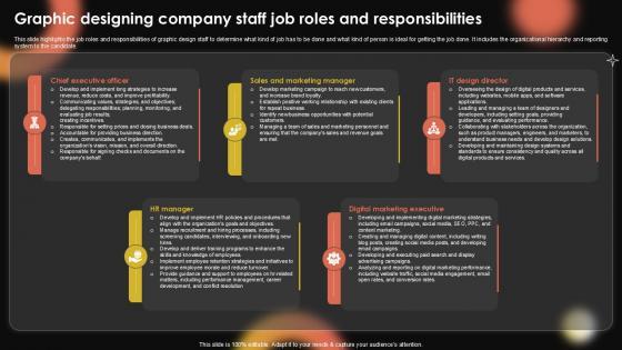 This slide highlights the job roles and responsibilities of graphic design staff to determine what kind of job has to be done and what kind of person is ideal for getting the job done. It includes the organizational hierarchy and reporting system to the candidate. Make sure to capture your audiences attention in your business displays with our gratis customizable Creative Agency Business Plan Graphic Designing Company Staff Job Roles And Responsibilities BP SS V. These are great for business strategies, office conferences, capital raising or task suggestions. If you desire to acquire more customers for your tech business and ensure they stay satisfied, create your own sales presentation with these plain slides. This slide highlights the job roles and responsibilities of graphic design staff to determine what kind of job has to be done and what kind of person is ideal for getting the job done. It includes the organizational hierarchy and reporting system to the candidate.