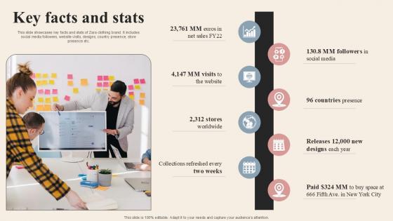 This slide showcases key facts and stats of Zara clothing brand. It includes social media followers, website visits, designs, country presence, store presence etc. Coming up with a presentation necessitates that the majority of the effort goes into the content and the message you intend to convey. The visuals of a PowerPoint presentation can only be effective if it supplements and supports the story that is being told. Keeping this in mind our experts created Key Facts And Stats Branded Clothing Company Profile PPT Template CP SS V to reduce the time that goes into designing the presentation. This way, you can concentrate on the message while our designers take care of providing you with the right template for the situation. This slide showcases key facts and stats of Zara clothing brand. It includes social media followers, website visits, designs, country presence, store presence etc.