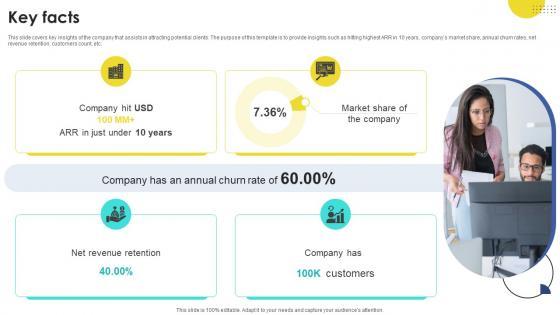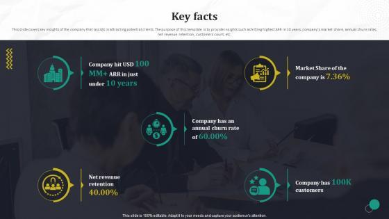 This slide covers key insights of the company that assists in attracting potential clients. The purpose of this template is to provide insights such as hitting highest ARR in 10 years, companys market share, annual churn rates, net revenue retention, customers count, etc. Find highly impressive Key Facts Automated Workflow Software Funding Pitch Deck For Company on Slidegeeks to deliver a meaningful presentation. You can save an ample amount of time using these presentation templates. No need to worry to prepare everything from scratch because Slidegeeks experts have already done a huge research and work for you. You need to download Key Facts Automated Workflow Software Funding Pitch Deck For Company for your upcoming presentation. All the presentation templates are 100 percent editable and you can change the color and personalize the content accordingly. Download now This slide covers key insights of the company that assists in attracting potential clients. The purpose of this template is to provide insights such as hitting highest ARR in 10 years, companys market share, annual churn rates, net revenue retention, customers count, etc.