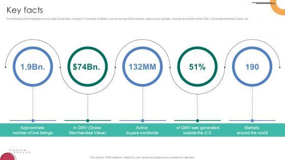 The following slide highlights various stats about eBay company. It consists of details such as number of live listings, active buyers globally, markets around the world, GMV Gross Merchandise Value, etc.Coming up with a presentation necessitates that the majority of the effort goes into the content and the message you intend to convey. The visuals of a PowerPoint presentation can only be effective if it supplements and supports the story that is being told. Keeping this in mind our experts created Key Facts C2C Ecommerce Platform Company Profile CP SS V to reduce the time that goes into designing the presentation. This way, you can concentrate on the message while our designers take care of providing you with the right template for the situation. The following slide highlights various stats about eBay company. It consists of details such as number of live listings, active buyers globally, markets around the world, GMV Gross Merchandise Value, etc.