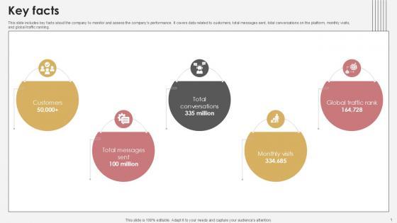 This slide includes key facts about the company to monitor and assess the companys performance. It covers data related to customers, total messages sent, total conversations on the platform, monthly visits, and global traffic ranking. If your project calls for a presentation, then Slidegeeks is your go-to partner because we have professionally designed, easy-to-edit templates that are perfect for any presentation. After downloading, you can easily edit Key Facts Communication Tech Company Pitch Deck PPT Template and make the changes accordingly. You can rearrange slides or fill them with different images. Check out all the handy templates This slide includes key facts about the company to monitor and assess the companys performance. It covers data related to customers, total messages sent, total conversations on the platform, monthly visits, and global traffic ranking.