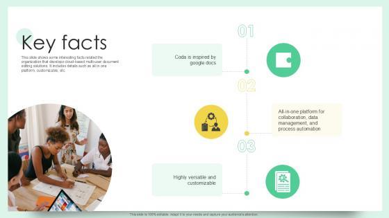 This slide shows some interesting facts related the organization that develops cloud-based multi-user document editing solutions. It includes details such as all in one platform, customizable, etc. If your project calls for a presentation, then Slidegeeks is your go-to partner because we have professionally designed, easy-to-edit templates that are perfect for any presentation. After downloading, you can easily edit Key Facts Document Creation Software Company Fundraising Ppt Template and make the changes accordingly. You can rearrange slides or fill them with different images. Check out all the handy templates This slide shows some interesting facts related the organization that develops cloud-based multi-user document editing solutions. It includes details such as all in one platform, customizable, etc.