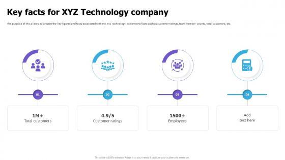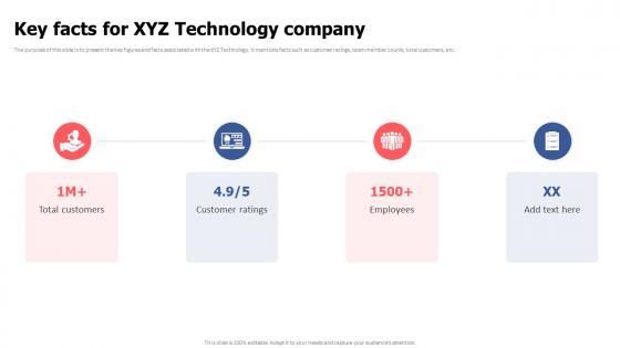 The purpose of this slide is to present the key figures and facts associated with the XYZ Technology. It mentions facts such as customer ratings, team member counts, total customers, etc. Whether you have daily or monthly meetings, a brilliant presentation is necessary. Key Facts For XYZ Technology Company Cloud Game Development Fundraising Pitch Deck can be your best option for delivering a presentation. Represent everything in detail using Key Facts For XYZ Technology Company Cloud Game Development Fundraising Pitch Deck and make yourself stand out in meetings. The template is versatile and follows a structure that will cater to your requirements. All the templates prepared by Slidegeeks are easy to download and edit. Our research experts have taken care of the corporate themes as well. So, give it a try and see the results. The purpose of this slide is to present the key figures and facts associated with the XYZ Technology. It mentions facts such as customer ratings, team member counts, total customers, etc.