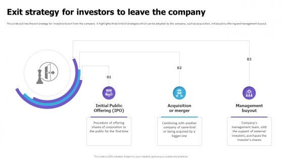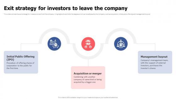 This slide outlines the exit strategy for investors to exit from the company. It highlights three kind of strategies which can be adopted by the company, such as acquisition, initial public offering and management buyout. There are so many reasons you need a Exit Strategy For Investors To Leave The Company Cloud Game Development Fundraising Pitch Deck. The first reason is you can not spend time making everything from scratch, Thus, Slidegeeks has made presentation templates for you too. You can easily download these templates from our website easily. This slide outlines the exit strategy for investors to exit from the company. It highlights three kind of strategies which can be adopted by the company, such as acquisition, initial public offering and management buyout.