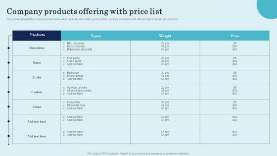 This slide highlights the company products line which includes chocolates, gums, drinks, cookies, and cakes with different types, weight and price list. Do you know about Slidesgeeks Company Products Offering With Price List Ppt PowerPoint Presentation File Professional PDF These are perfect for delivering any kind od presentation. Using it, create PowerPoint presentations that communicate your ideas and engage audiences. Save time and effort by using our pre-designed presentation templates that are perfect for a wide range of topic. Our vast selection of designs covers a range of styles, from creative to business, and are all highly customizable and easy to edit. Download as a PowerPoint template or use them as Google Slides themes.