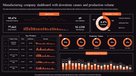 This slide showcases the manufacturing company dashboard which showcases downtime causes top 5 products with price with sold items and revenue, it also includes production volume by top machines. Do you know about Slidesgeeks Food Processing Business Profile Manufacturing Company Dashboard Brochure Pdf These are perfect for delivering any kind od presentation. Using it, create PowerPoint presentations that communicate your ideas and engage audiences. Save time and effort by using our pre designed presentation templates that are perfect for a wide range of topic. Our vast selection of designs covers a range of styles, from creative to business, and are all highly customizable and easy to edit. Download as a PowerPoint template or use them as Google Slides themes. This slide showcases the manufacturing company dashboard which showcases downtime causes top 5 products with price with sold items and revenue, it also includes production volume by top machines.