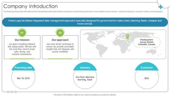 The following slide provides information about company that provides data collection and analysis services to the government. It covers facilities such as overview, mission, founding year, customers, industry, and headquarters. Slidegeeks is one of the best resources for PowerPoint templates. You can download easily and regulate Company Introduction Investor Oriented Urbanlogiq Fundraising Deck for your personal presentations from our wonderful collection. A few clicks is all it takes to discover and get the most relevant and appropriate templates. Use our Templates to add a unique zing and appeal to your presentation and meetings. All the slides are easy to edit and you can use them even for advertisement purposes. The following slide provides information about company that provides data collection and analysis services to the government. It covers facilities such as overview, mission, founding year, customers, industry, and headquarters.
