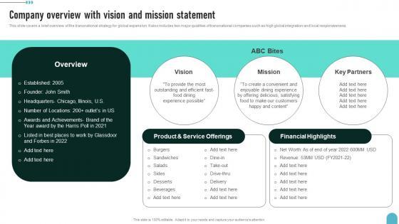 This slide covers a brief overview of the transnational strategy for global expansion. It also includes two major qualities of transnational companies such as high global integration and local responsiveness.There are so many reasons you need a Company Overview With Vision Enhancing Global Presence Introduction Pdf. The first reason is you can not spend time making everything from scratch, Thus, Slidegeeks has made presentation templates for you too. You can easily download these templates from our website easily. This slide covers a brief overview of the transnational strategy for global expansion. It also includes two major qualities of transnational companies such as high global integration and local responsiveness.