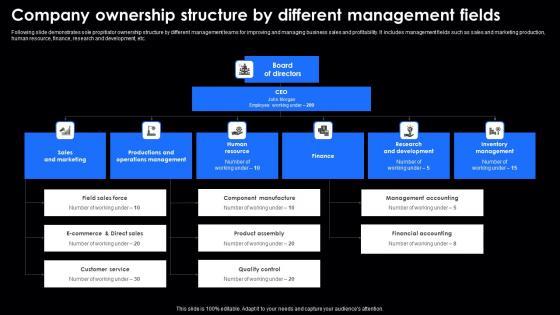 Following slide demonstrates sole propitiator ownership structure by different management teams for improving and managing business sales and profitability. It includes management fields such as sales and marketing production, human resource, finance, research and development, etc. Pitch your topic with ease and precision using this Company Ownership Structure By Different Management Fields Demonstration Pdf. This layout presents information on Human Resource, Finance, Sales And Marketing. It is also available for immediate download and adjustment. So, changes can be made in the color, design, graphics or any other component to create a unique layout. Following slide demonstrates sole propitiator ownership structure by different management teams for improving and managing business sales and profitability. It includes management fields such as sales and marketing production, human resource, finance, research and development, etc.