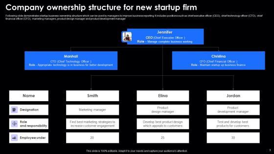 Following slide demonstrates startup business ownership structure which can be used by managers to improve business reporting. It includes positions such as chief executive officer CEO, chief technology officer CTO, chief financial officer CFO, marketing managers, product design manager and product development manager Pitch your topic with ease and precision using this Company Ownership Structure For New Startup Firm Infographics Pdf. This layout presents information on Role And Responsibility, Marketing Manager, Product Design Manager. It is also available for immediate download and adjustment. So, changes can be made in the color, design, graphics or any other component to create a unique layout. Following slide demonstrates startup business ownership structure which can be used by managers to improve business reporting. It includes positions such as chief executive officer CEO, chief technology officer CTO, chief financial officer CFO, marketing managers, product design manager and product development manager