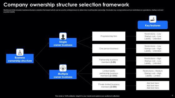 Mentioned slide includes business structure selection framework which can be used by entrepreneurs to determine most feasible ownership. It includes key components such as restrictions on operations, startup cost and payable liability Showcasing this set of slides titled Company Ownership Structure Selection Framework Sample Pdf. The topics addressed in these templates are Single Owner Business, Business Ownership Structure, Multiple Owner Business. All the content presented in this PPT design is completely editable. Download it and make adjustments in color, background, font etc. as per your unique business setting. Mentioned slide includes business structure selection framework which can be used by entrepreneurs to determine most feasible ownership. It includes key components such as restrictions on operations, startup cost and payable liability