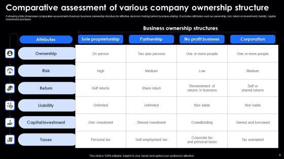 Following slide showcases comparative assessment of various business ownership structure for effective decision making before business startup. It includes attributes such as ownership, risk, return on investment, liability, capital investment and taxes Showcasing this set of slides titled Comparative Assessment Of Various Company Ownership Structure Ideas Pdf. The topics addressed in these templates are Risk, Ownership, Liability. All the content presented in this PPT design is completely editable. Download it and make adjustments in color, background, font etc. as per your unique business setting. Following slide showcases comparative assessment of various business ownership structure for effective decision making before business startup. It includes attributes such as ownership, risk, return on investment, liability, capital investment and taxes