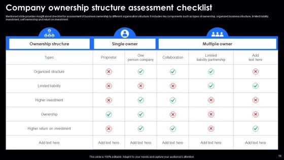 Mentioned slide provides insight about checklist for assessment of business ownership by different organisation structure. It includes key components such as types of ownership, organized business structure, limited liability, investment, self ownership and return on investment Pitch your topic with ease and precision using this Company Ownership Structure Assessment Checklist Themes Pdf. This layout presents information on Organized Structure, Limited Liability, Ownership. It is also available for immediate download and adjustment. So, changes can be made in the color, design, graphics or any other component to create a unique layout. Mentioned slide provides insight about checklist for assessment of business ownership by different organisation structure. It includes key components such as types of ownership, organized business structure, limited liability, investment, self ownership and return on investment