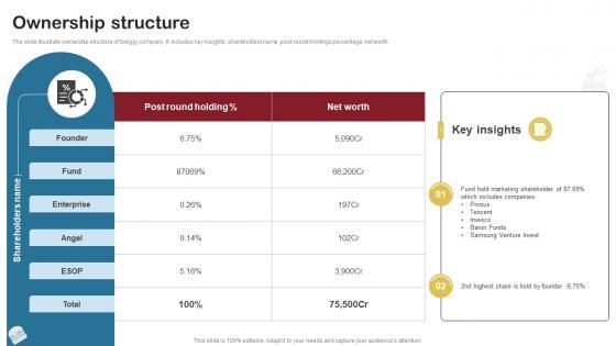 The slide illustrate ownership structure of Swiggy company. It includes key insights, shareholders name, post-round holdings percentage, net worth. Are you searching for a Ownership Structure Grocery Delivery Company Profile CP SS V that is uncluttered, straightforward, and original Its easy to edit, and you can change the colors to suit your personal or business branding. For a presentation that expresses how much effort you have put in, this template is ideal With all of its features, including tables, diagrams, statistics, and lists, its perfect for a business plan presentation. Make your ideas more appealing with these professional slides. Download Ownership Structure Grocery Delivery Company Profile CP SS V from Slidegeeks today. The slide illustrate ownership structure of Swiggy company. It includes key insights, shareholders name, post-round holdings percentage, net worth.