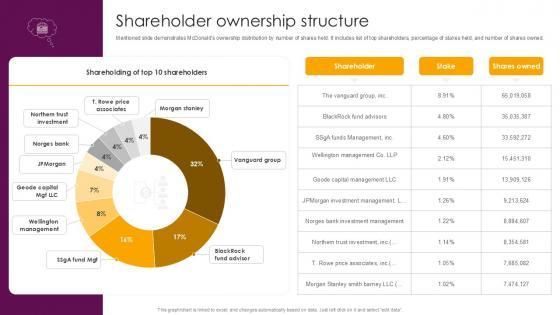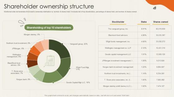 Mentioned slide demonstrates McDonalds ownership distribution by number of shares held. It includes list of top shareholders, percentage of stakes held, and number of shares owned. There are so many reasons you need a Shareholder Ownership Structure Food And Beverages Company Profile Ppt Example CP SS V The first reason is you can not spend time making everything from scratch, Thus, Slidegeeks has made presentation templates for you too. You can easily download these templates from our website easily. Mentioned slide demonstrates McDonalds ownership distribution by number of shares held. It includes list of top shareholders, percentage of stakes held, and number of shares owned.