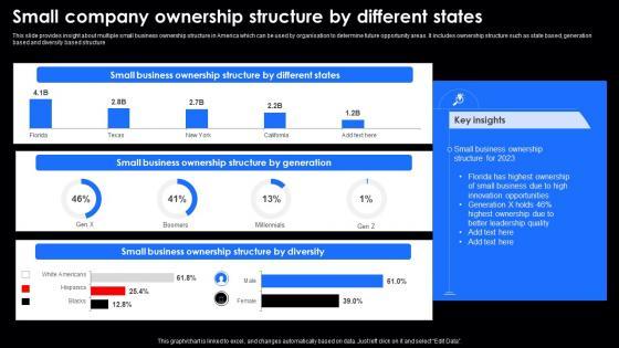 This slide provides insight about multiple small business ownership structure in America which can be used by organisation to determine future opportunity areas. It includes ownership structure such as state based, generation based and diversity based structure Showcasing this set of slides titled Small Company Ownership Structure By Different States Structure Pdf. The topics addressed in these templates are Small Company Ownership Structure, Different States. All the content presented in this PPT design is completely editable. Download it and make adjustments in color, background, font etc. as per your unique business setting. This slide provides insight about multiple small business ownership structure in America which can be used by organisation to determine future opportunity areas. It includes ownership structure such as state based, generation based and diversity based structure