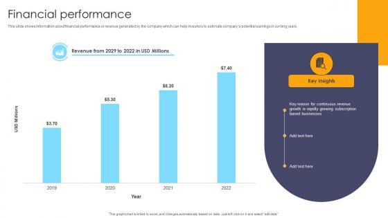 This slide shows information about financial performance or revenue generated by the company which can help investors to estimate companys potential earnings in coming years. From laying roadmaps to briefing everything in detail, our templates are perfect for you. You can set the stage with your presentation slides. All you have to do is download these easy-to-edit and customizable templates. Financial Performance Customer Experience Management Company Investor Funding Elevator Pitch Deck will help you deliver an outstanding performance that everyone would remember and praise you for. Do download this presentation today. This slide shows information about financial performance or revenue generated by the company which can help investors to estimate companys potential earnings in coming years.