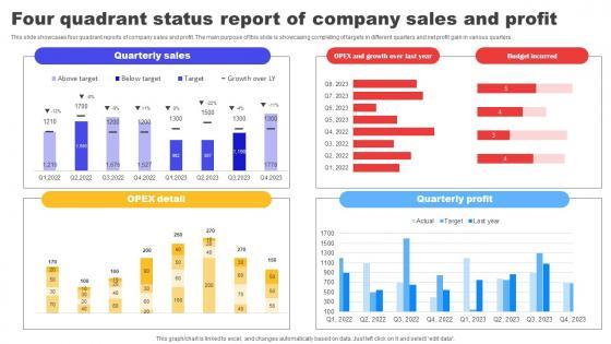 This slide showcases four quadrant reports of company sales and profit. The main purpose of this slide is showcasing completing of targets in different quarters and net profit gain in various quarters. Showcasing this set of slides titled Four Quadrant Status Report Of Company Sales And Profit Pictures pdf. The topics addressed in these templates are Quarterly Sales,OPEX Detail,Quarterly Profit. All the content presented in this PPT design is completely editable. Download it and make adjustments in color, background, font etc. as per your unique business setting. This slide showcases four quadrant reports of company sales and profit. The main purpose of this slide is showcasing completing of targets in different quarters and net profit gain in various quarters.