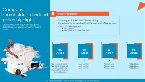 This slide provides glimpse about summary of shareholders dividend policy of the company. It includes payout ratio, ways of dividend payment, cash dividend, bonus share at no additional cost, etc.This Company Shareholders Dividend Policy Highlights Tactical Financial Governance Icons Pdf is perfect for any presentation, be it in front of clients or colleagues. It is a versatile and stylish solution for organizing your meetings. The Company Shareholders Dividend Policy Highlights Tactical Financial Governance Icons Pdf features a modern design for your presentation meetings. The adjustable and customizable slides provide unlimited possibilities for acing up your presentation. Slidegeeks has done all the homework before launching the product for you. So, do not wait, grab the presentation templates today This slide provides glimpse about summary of shareholders dividend policy of the company. It includes payout ratio, ways of dividend payment, cash dividend, bonus share at no additional cost, etc.