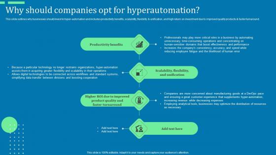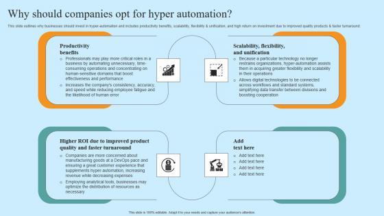 This slide outlines why businesses should invest in hyper-automation and includes productivity benefits, scalability, flexibility and unification, and high return on investment due to improved quality products and faster turnaround. This Intelligent Process Automation IPA Why Should Companies Opt For Hyper Automation Download PDF from Slidegeeks makes it easy to present information on your topic with precision. It provides customization options, so you can make changes to the colors, design, graphics, or any other component to create a unique layout. It is also available for immediate download, so you can begin using it right away. Slidegeeks has done good research to ensure that you have everything you need to make your presentation stand out. Make a name out there for a brilliant performance.