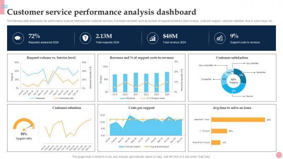 The following slide showcases key performance analysis dashboard for customer services. It includes elements such as number of request answered, total revenue, costs per support, customer retention, time to solve issue, etc. Slidegeeks is here to make your presentations a breeze with Customer Service Performance How To Improve Company PPT Sample Strategy SS V With our easy-to-use and customizable templates, you can focus on delivering your ideas rather than worrying about formatting. With a variety of designs to choose from, you are sure to find one that suits your needs. And with animations and unique photos, illustrations, and fonts, you can make your presentation pop. So whether you are giving a sales pitch or presenting to the board, make sure to check out Slidegeeks first The following slide showcases key performance analysis dashboard for customer services. It includes elements such as number of request answered, total revenue, costs per support, customer retention, time to solve issue, etc.