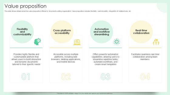 This slide shows details about the value preposition offered by documents editing organization. Value preposition includes flexibility, customizability, integration of multiple tools, etc. Explore a selection of the finest Value Proposition Document Creation Software Company Fundraising Ppt Slide here. With a plethora of professionally designed and pre-made slide templates, you can quickly and easily find the right one for your upcoming presentation. You can use our Value Proposition Document Creation Software Company Fundraising Ppt Slide to effectively convey your message to a wider audience. Slidegeeks has done a lot of research before preparing these presentation templates. The content can be personalized and the slides are highly editable. Grab templates today from Slidegeeks. This slide shows details about the value preposition offered by documents editing organization. Value preposition includes flexibility, customizability, integration of multiple tools, etc.