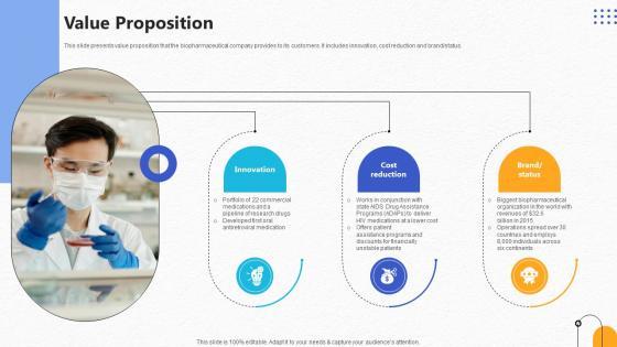 This slide presents value proposition that the biopharmaceutical company provides to its customers. It includes innovation, cost reduction and brand or status. Explore a selection of the finest Value Proposition Pharmaceutical R And D Company Pitch Deck here. With a plethora of professionally designed and pre-made slide templates, you can quickly and easily find the right one for your upcoming presentation. You can use our Value Proposition Pharmaceutical R And D Company Pitch Deck to effectively convey your message to a wider audience. Slidegeeks has done a lot of research before preparing these presentation templates. The content can be personalized and the slides are highly editable. Grab templates today from Slidegeeks. This slide presents value proposition that the biopharmaceutical company provides to its customers. It includes innovation, cost reduction and brand or status.
