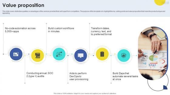 This slide covers distinctive qualities or advantages of the services provided that set it apart from competitors. The purpose of this template is to highlight the key selling points and value proposition that make the product unique and appealing. Explore a selection of the finest Value Proposition Automated Workflow Software Funding Pitch Deck For Company here. With a plethora of professionally designed and pre-made slide templates, you can quickly and easily find the right one for your upcoming presentation. You can use our Value Proposition Automated Workflow Software Funding Pitch Deck For Company to effectively convey your message to a wider audience. Slidegeeks has done a lot of research before preparing these presentation templates. The content can be personalized and the slides are highly editable. Grab templates today from Slidegeeks. This slide covers distinctive qualities or advantages of the services provided that set it apart from competitors. The purpose of this template is to highlight the key selling points and value proposition that make the product unique and appealing.