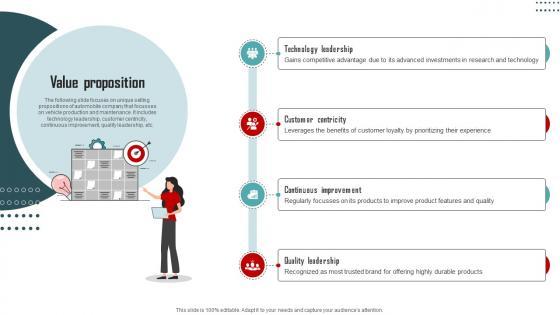 The following slide focuses on unique selling propositions of automobile company that focusses on vehicle production and maintenance. It includes technology leadership, customer centricity, continuous improvement, quality leadership, etc. Explore a selection of the finest Value Proposition Vehicle Company Capital Funding Pitch Deck here. With a plethora of professionally designed and pre-made slide templates, you can quickly and easily find the right one for your upcoming presentation. You can use our Value Proposition Vehicle Company Capital Funding Pitch Deck to effectively convey your message to a wider audience. Slidegeeks has done a lot of research before preparing these presentation templates. The content can be personalized and the slides are highly editable. Grab templates today from Slidegeeks. The following slide focuses on unique selling propositions of automobile company that focusses on vehicle production and maintenance. It includes technology leadership, customer centricity, continuous improvement, quality leadership, etc.
