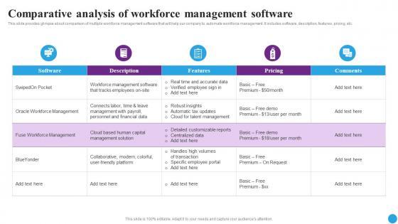 This slide provides glimpse about comparison of multiple workforce management software that will help our company to automate workforce management. It includes software, description, features, pricing, etc.From laying roadmaps to briefing everything in detail, our templates are perfect for you. You can set the stage with your presentation slides. All you have to do is download these easy-to-edit and customizable templates. Comparative Analysis Of Workforce Strategic Approaches To Streamline Designs Pdf will help you deliver an outstanding performance that everyone would remember and praise you for. Do download this presentation today. This slide provides glimpse about comparison of multiple workforce management software that will help our company to automate workforce management. It includes software, description, features, pricing, etc.