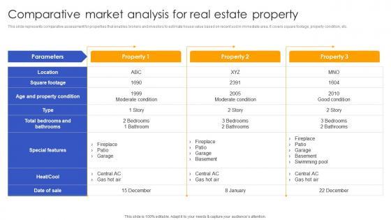 This slide represents comparative assessment for properties that enables brokers and investors to estimate house value based on recent sod in immediate area. It covers square footage, property condition, etc. If you are looking for a format to display your unique thoughts, then the professionally designed Comparative Market Analysis Real Effective Real Estate Flipping Approaches Microsoft Pdf is the one for you. You can use it as a Google Slides template or a PowerPoint template. Incorporate impressive visuals, symbols, images, and other charts. Modify or reorganize the text boxes as you desire. Experiment with shade schemes and font pairings. Alter, share or cooperate with other people on your work. Download Comparative Market Analysis Real Effective Real Estate Flipping Approaches Microsoft Pdf and find out how to give a successful presentation. Present a perfect display to your team and make your presentation unforgettable. This slide represents comparative assessment for properties that enables brokers and investors to estimate house value based on recent sod in immediate area. It covers square footage, property condition, etc.