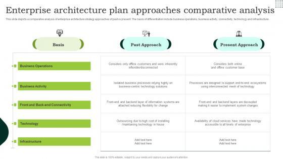 This slide depicts a comparative analysis of enterprise architecture strategy approaches of past vs present. The basis of differentiation include business operations, business activity, connectivity, technology and infrastructure. Showcasing this set of slides titled Enterprise Architecture Plan Approaches Comparative Analysis Designs Pdf. The topics addressed in these templates are Business Operations, Business Activity, Technology. All the content presented in this PPT design is completely editable. Download it and make adjustments in color, background, font etc. as per your unique business setting. This slide depicts a comparative analysis of enterprise architecture strategy approaches of past vs present. The basis of differentiation include business operations, business activity, connectivity, technology and infrastructure.