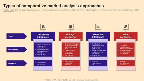 This slide exhibits variety of areas applied to strategic planning. It aims to gain better understanding of customers and competition for making effective decisions. It involves information related to competitive intelligence, predictive understanding, etc.Pitch your topic with ease and precision using this Types Of Comparative Market Analysis Approaches Structure Pdf This layout presents information on Competitive Intelligence, Strategic Intelligence, Predictive Intelligence It is also available for immediate download and adjustment. So, changes can be made in the color, design, graphics or any other component to create a unique layout. This slide exhibits variety of areas applied to strategic planning. It aims to gain better understanding of customers and competition for making effective decisions. It involves information related to competitive intelligence, predictive understanding, etc.