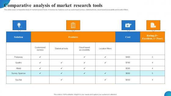 This slide covers comparative study of market research tools. It involves key features such as customized surveys, statistical tools, cloud based accessibility and location filters. This Comparative Analysis Of Market Research Tools Effective Strategies To Enhance Microsoft Pdf from Slidegeeks makes it easy to present information on your topic with precision. It provides customization options, so you can make changes to the colors, design, graphics, or any other component to create a unique layout. It is also available for immediate download, so you can begin using it right away. Slidegeeks has done good research to ensure that you have everything you need to make your presentation stand out. Make a name out there for a brilliant performance. This slide covers comparative study of market research tools. It involves key features such as customized surveys, statistical tools, cloud based accessibility and location filters.
