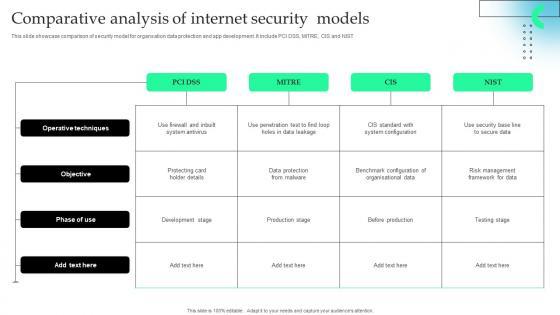 This slide showcase comparison of security model for organsation data protection and app development. It include PCI DSS, MITRE, CIS and NIST Pitch your topic with ease and precision using this Comparative Analysis Of Internet Security Models Slides Pdf This layout presents information on Operative Techniques, Development Stage, Benchmark Configuration It is also available for immediate download and adjustment. So, changes can be made in the color, design, graphics or any other component to create a unique layout. This slide showcase comparison of security model for organsation data protection and app development. It include PCI DSS, MITRE, CIS and NIST